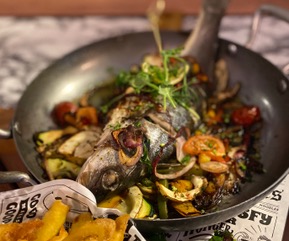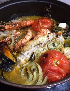 Cataplana 2 personen 30 pp (In een heerlijke boulion |gegaarde |vis en schelpdieren tomaatjes/aardappel tjes/knoflook/groenekruiden/paprika/pepers/kappertjes/ui/paprika)