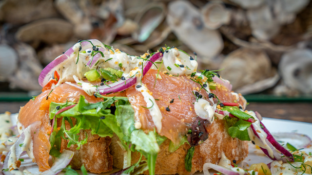 Zalm (Gerookte zalm|kappertjes|rode ui|sla|mierikswortelsaus)